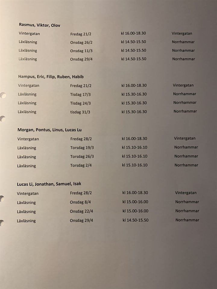 MÅN: Fys på Friskis och Svettis friviilig tid. Styrkepass 1. TIS: VILA. ONS: 14.50-15.50 HELA SPELAREN (Läxläsning på Norrhammar för Johan, Viktor, Olov och Rasmus). 17.15 – 18.30 Bollpass ute på Guldvallen (Skelleftehamn). Ombytt och klar på Norrvalla 16.45 för samåkning (se till att fixa plats innan!) till Skelleftehamn. TORS: 20.15 – 21.15 Bollpass i Bolltältet (Skogsvallen). Ombytt och klar i omklädningsrummet 20.00 FRE: VILA. (HELA SPELAREN på vintergatan 16.00-18.30 för B3 och B4). LÖR: 10.30 – 12.00 Bollpass ute på Guldvallen. Ombytt och klar på Norrvalla 10.00 för samåkning (se till att fixa plats innan!) till Skelleftehamn. SÖN: VILA.