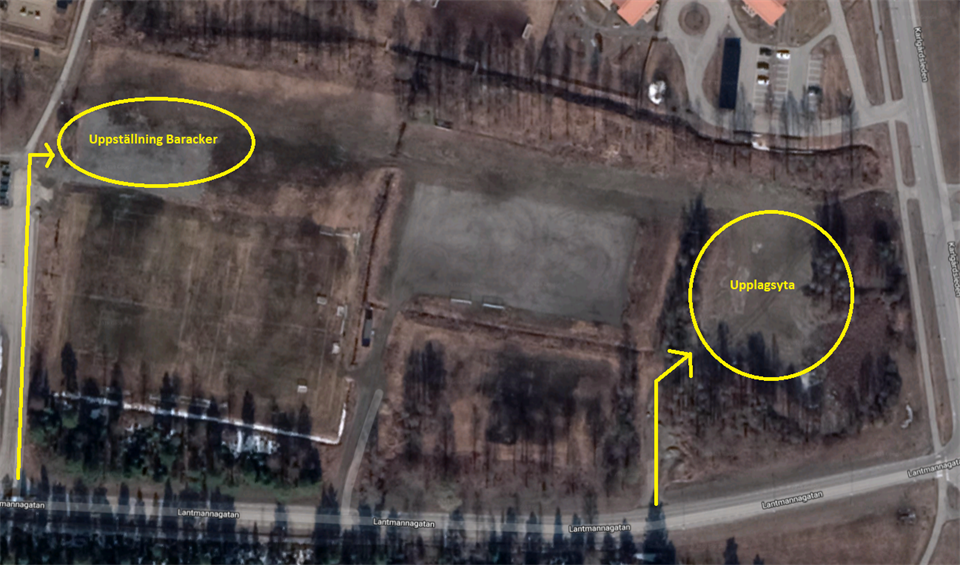 Kommunen kommer använda upplagsytor invid fotbollsplanerna på Nyckelpigan. De har för avsikt att använda ytorna enligt bifogat till baracker samt upplag, med etablering under v.35-36. Önskemålet från ungdomsgruppen var att barnens säkerhet skulle prioriteras. Tyngre trafik kommer gå till utpekad upplagsyta enligt bifogad bild, dock endast 07.00-16.00 på vardagar. Ett önskemål var att infarten till upplaget skulle vara från Karlgårdsleden, men av trafiksäkerhetsskäl så är det inte möjligt.