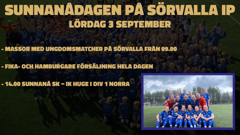 Varmt välkomna nu på lördag den 3/9 för en dag fylld av fotboll på Sörvalla IP! Matcherna kickar igång 08.45 och SSK Dam – IK Huge spelar kl14.00. Kiosken kommer vara öppen hela dagen och grillen erbjuder hamburgare. Som alltid gratis inträde för alla medlemmar i Sunnanå SK. Enskilda fotbollslagen bestämmer själva om de fortfarande vill ordna med eget fika efter match eller om ni vill guida spelarna till anläggningens kiosk.