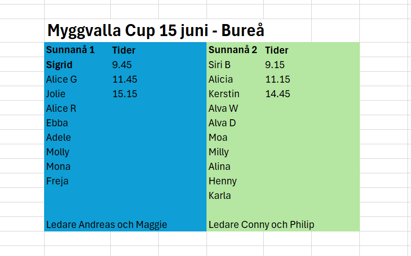 Så kul med cup!! Här kommer lagen inför lördagens cup. Reservation för att sjukdom kan göra att någon behöver byta lag. Vi tänker ha vårt fina tält som basecamp någonstans i nära anslutning till planerna. Vi ledare har också kommit fram till att vi vill att alla tjejer kommer samtidigt då det bara skiljer 30 min i speltid. Vi är ETT lag men ställer upp med två uppställningar. Samma gäller sista matchen - vi hejar på varandra! Samling 8.45 mellan klubbhuset och planerna. De som spelar andra matchen kan tex få hjälpa till att ställa i ordning tältet medan första laget värmer upp för match. Det kommer att finnas försäljning på plats men ta gärna med lite mellis i form av tex frukt, macka, osv. Vi ser gärna att lördagsgodiset äts på kvällen och inte under cupdagen. Onda magar och match brukar vara en dålig kombo! :) Länk: Cupsidan Ps. På söndag har vi tre matcher och det kommer att finnas behov av att tjejerna spelar dubbelt. VIll ditt barn dubbla - skriv här i tråden så kallas ni till ytterligare en match. Hör av er om ni har frågor. Nu hoppas vi på en härlig fotbollshelg!
